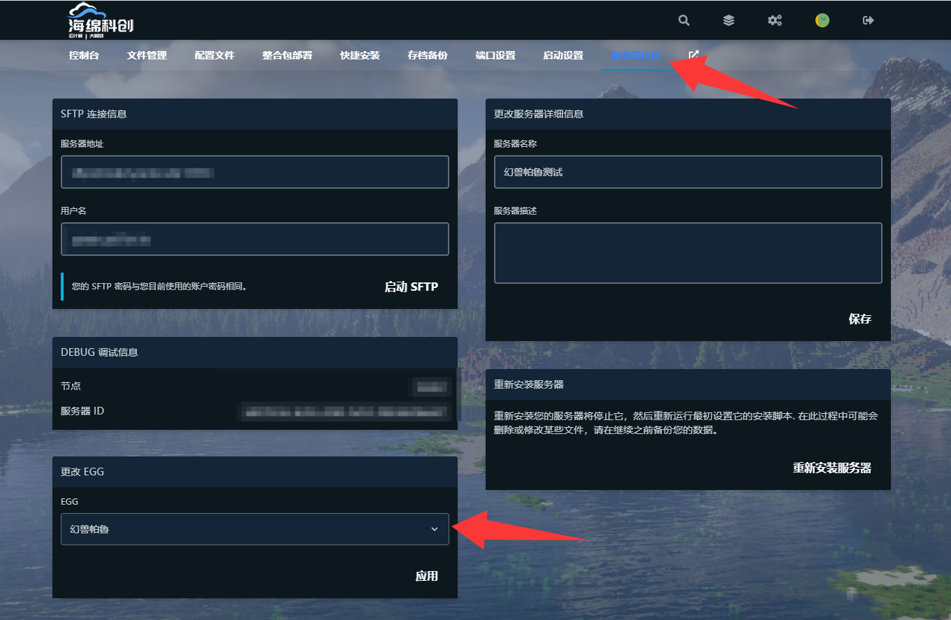 进入服务器设置后,点击“更改 EGG”选项。