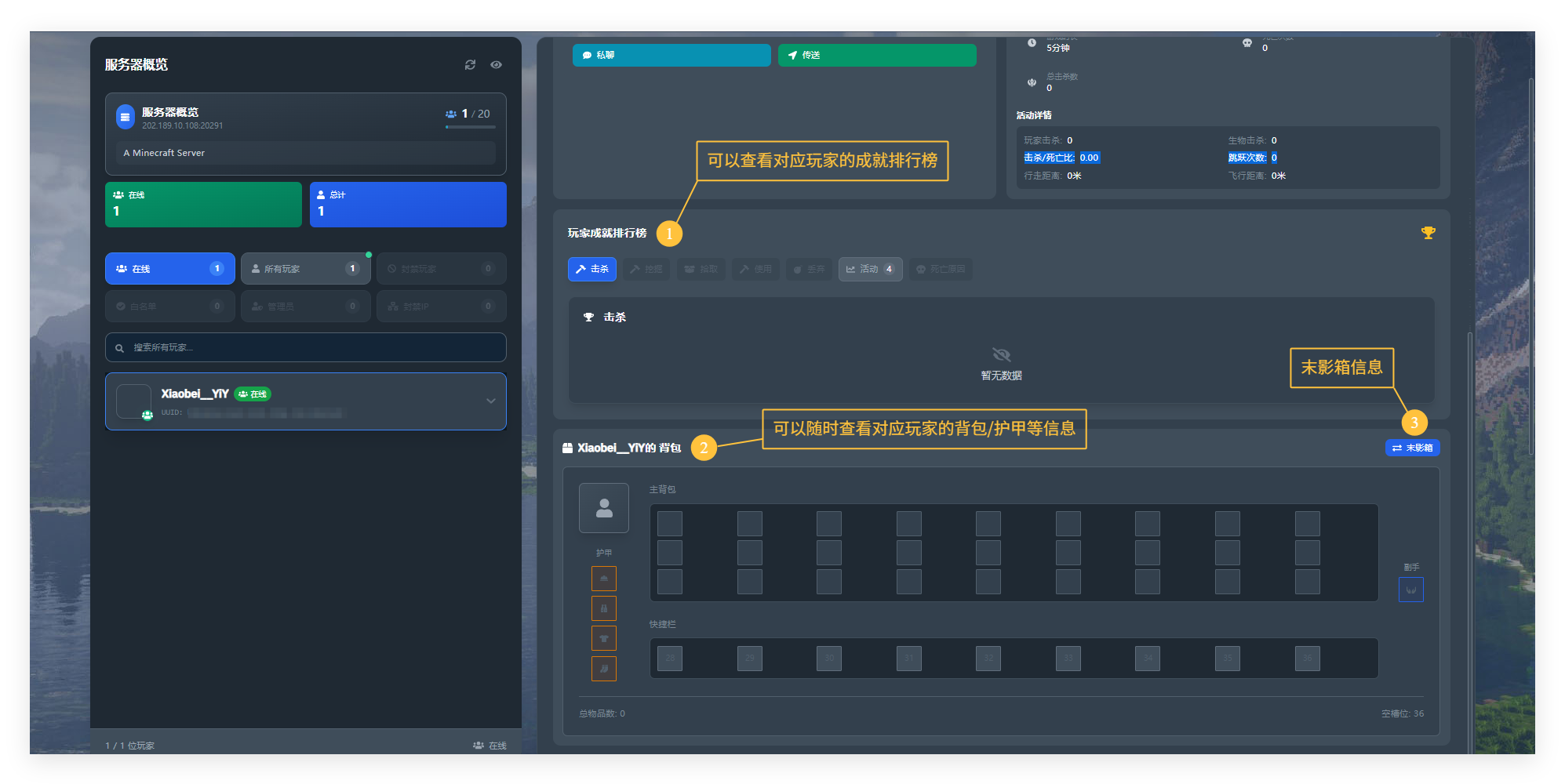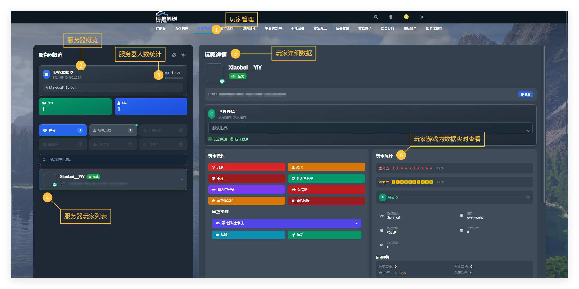 目录 搜索 展开 ✨了解海绵面板的功能💝合理的配置选择⚔️功能 | 控制台⚔️功能 | 在线文件管理⚔️功能 | 玩家管理⚔️功能 | 服务器配置⚔️功能 | 纯净部署⚔️功能 | 整合包部署⚔️功能 | 个性域名⚔️功能 | 资源分享⚔️功能 | 快捷安装⚔️功能 | 存档备份⚔️功能 | 端口设置⚔️功能 | 节点信息⚔️功能 | 服务器设置⚔️功能 | SFTP信息与重装⚔️功能 | 定时任务🧸新手入门流程指南🎮入门 | 如何登录控制台🎮入门 | 整合包部署开服🎮入门 | 如何给服务器添加MOD🎮入门 | 实用指令大全🎮入门 | 服务器基础设置🎮入门 | 配置项修改注释🎮入门 | Java地图兼容问题🎮入门 | 如何替换地图/存档🎮入门 | 基岩版开服教程🎮高级 | java版服务器概念一览🎮高级 | java版优化指南🎮高级 | 手动备份服务器存档🎮高级 |免费服务器手动备份数据🎮高级|皮肤站配置教程🔎服务端开服教学🎮高级 | Forge整合包开服🎮高级 | Fabric服务端开服🎮高级 | 使用MCDR进行开服🎮高级 | 适配大部分服务端的开服🎮高级| CurseForge整合包开服🎮高级|纯净部署核心开服🌼常见问题解决🌱常见崩溃 | 缺少启动核心🌱常见崩溃 | JAVA版本错误🌱常见崩溃 | 开服卡住不动🌱常见崩溃 | 输入命令无反应🌱常见崩溃 | 解压时红色报错🩹服务器卡顿诊断🩹必看🩹内存不足导致卡顿🩹CPU单核性能不足导致卡顿🩹网络卡顿导致🩹服务器实体或玩家导致🛜无端口解析域名⚔️通用 | 隐藏端口域名(SRV解析)⚔️付费节点专属 | 无端口域名🤔服务器防黑措施/解决方案👿防黑措施👿“比利时”岩浆毁坏解决办法🧨纯净版一键包Pro🎨 | 功能概览🎃 | 基础指令合集🔰 | 登录系统⛏ | 创世神用法🚮 | 垃圾桶 暂无相关搜索结果! 阅读次数:5742 本文档使用 MinDoc 发布 ⚔️功能 | 玩家管理 全新的玩家管理界面全新设计研发的玩家管理界面作者:海绵联机 创建时间:2024-08-26 22:46最后编辑:xiaobei 更新时间:2025-12-13 14:26 提交评论