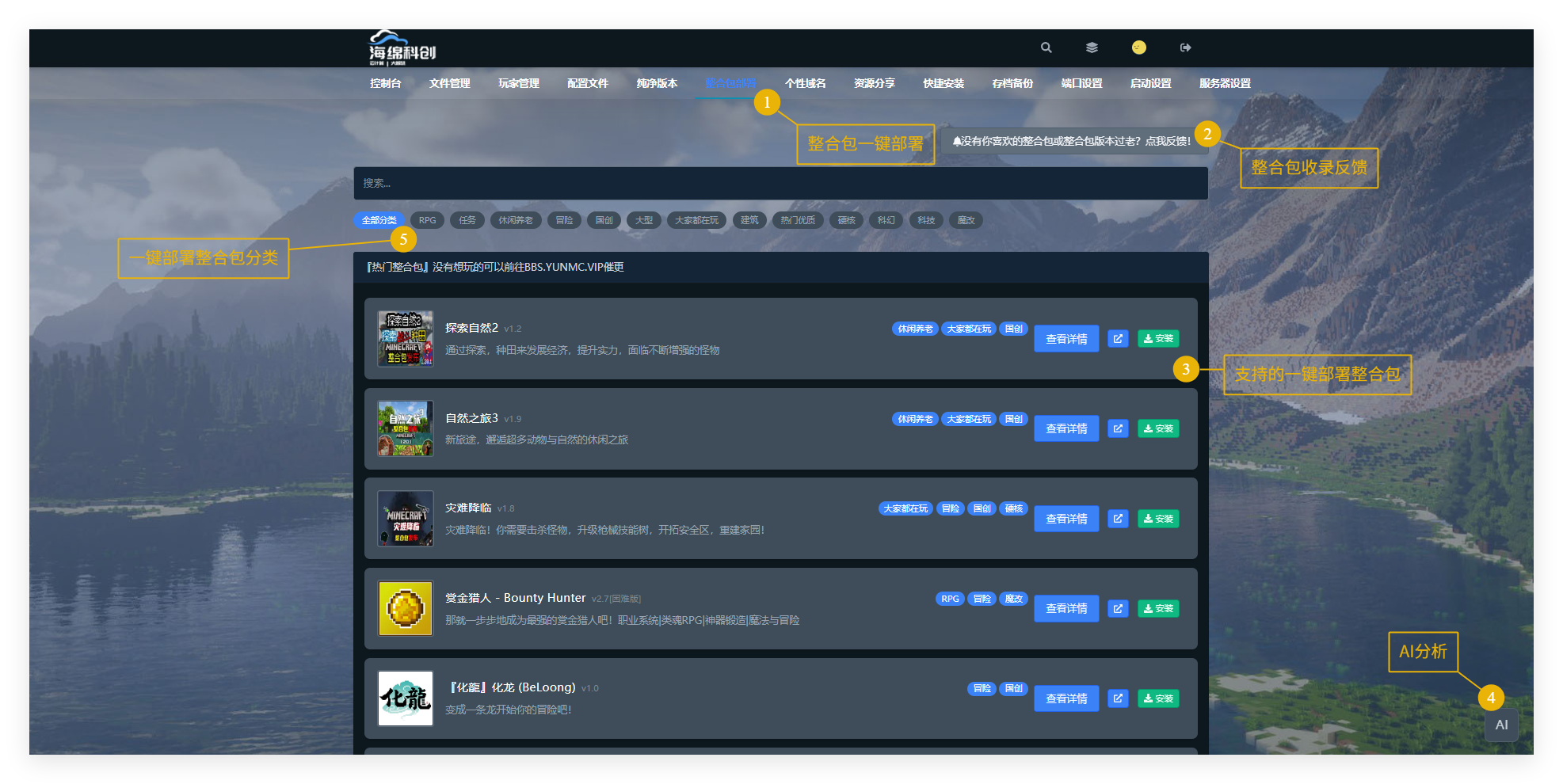 目录 搜索 展开 ✨海绵科创游戏云功能介绍💝服务器配置推荐⚔️功能 | 控制台⚔️功能 | 在线文件管理⚔️功能 | 玩家管理⚔️功能 | 服务器配置⚔️功能 | 纯净部署⚔️功能 | 整合包部署⚔️功能 | 个性域名⚔️功能 | 资源分享⚔️功能 | 快捷安装⚔️功能 | 存档备份⚔️功能 | 端口设置⚔️功能 | 节点信息⚔️功能 | 服务器设置⚔️功能 | SFTP信息与重装⚔️功能 | 定时任务🧸新手入门流程指南🎮必看 | 服务器续费/数据保留🎮入门 | 如何登录控制台🎮入门 | 整合包部署开服🎮入门 | 如何给服务器添加MOD🎮入门 | 实用指令大全🎮入门 | 服务器基础设置🎮入门 | 配置项修改注释🎮入门 | Java地图兼容问题🎮入门 | 如何替换地图/存档🎮入门 | 基岩版开服教程🎮入门 | 如何更换地图种子🎮入门 | 如何开新档🎮高级 | java版服务器术语一览🎮高级 | java版优化指南🎮高级 | 手动备份服务器存档🎮高级 | 免费服务器手动备份数据🎮高级 | 皮肤站配置教程🎮高级 | 内存优化指令解析🎮高级 | 海绵网盘教程🎮高级 | Ai-珊迪使用教程🎮高级 | 整合包制作服务端🔎服务端开服教学🎮高级 | Forge服务端开服🎮高级 | Fabric服务端开服🎮高级 | 使用MCDR进行开服🎮高级 | 纯净部署核心开服🎮高级 | 适配大部分服务端的开服🎮高级| CurseForge整合包开服🎮高级| 整合包无核心文件开服🎮高级| 第三方整合包服务端开服🌼常见问题🌱常见崩溃 | 缺少启动核心🌱常见崩溃 | JAVA版本错误🌱常见崩溃 | 开服卡住不动🌱常见崩溃 | 输入命令无反应🌱常见崩溃 | 解压时红色报错🌱常见疑问 | 纯净部署核心异常🩹服务器卡顿诊断🩹出现卡顿必看!🩹内存不足导致的卡顿🩹CPU单核性能不足导致卡顿🩹网络问题导致的卡顿🩹服务器实体或玩家导致的卡顿🛜无端口解析域名⚔️个性域名| 无端口域名⚔️通用 | 隐藏端口域名(SRV解析)🤔服务器防黑措施/解决方案👿防黑措施👿“比利时”岩浆毁坏解决办法🧨纯净版一键包Pro🎨 | 功能概览🎃 | 基础指令合集🔰 | 登录系统⛏ | 创世神用法🚮 | 垃圾桶 暂无相关搜索结果! 阅读次数:6161 本文档使用 MinDoc 发布 ⚔️功能 | 整合包部署 整合包部署目前已支持80+整合包一键部署作者:xiaobei 创建时间:2024-08-26 23:17最后编辑:xiaobei 更新时间:2026-03-16 02:04 提交评论