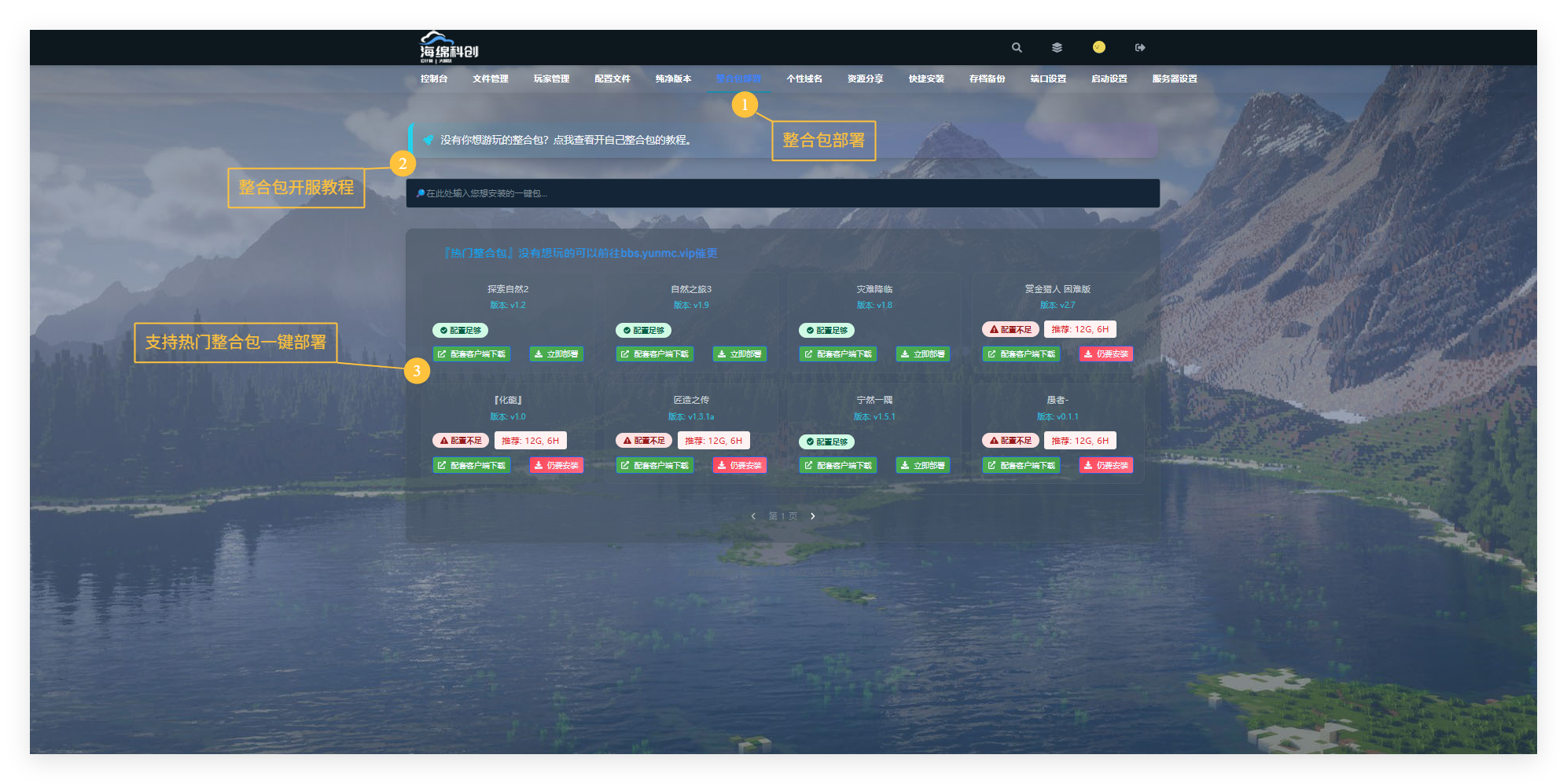 目录 搜索 展开 ✨了解海绵面板的功能💝合理的配置选择⚔️功能 | 控制台⚔️功能 | 在线文件管理⚔️功能 | 玩家管理⚔️功能 | 服务器配置⚔️功能 | 纯净部署⚔️功能 | 整合包部署⚔️功能 | 个性域名⚔️功能 | 资源分享⚔️功能 | 快捷安装⚔️功能 | 存档备份⚔️功能 | 端口设置⚔️功能 | 节点信息⚔️功能 | 服务器设置⚔️功能 | SFTP信息与重装⚔️功能 | 定时任务🧸新手入门流程指南🎮入门 | 如何登录控制台🎮入门 | 整合包部署开服🎮入门 | 如何给服务器添加MOD🎮入门 | 实用指令大全🎮入门 | 服务器基础设置🎮入门 | 配置项修改注释🎮入门 | Java地图兼容问题🎮入门 | 如何替换地图/存档🎮入门 | 基岩版开服教程🎮高级 | java版服务器概念一览🎮高级 | java版优化指南🎮高级 | 手动备份服务器存档🎮高级 |免费服务器手动备份数据🎮高级|皮肤站配置教程🔎服务端开服教学🎮高级 | Forge整合包开服🎮高级 | Fabric服务端开服🎮高级 | 使用MCDR进行开服🎮高级 | 适配大部分服务端的开服🎮高级| CurseForge整合包开服🎮高级|纯净部署核心开服🌼常见问题解决🌱常见崩溃 | 缺少启动核心🌱常见崩溃 | JAVA版本错误🌱常见崩溃 | 开服卡住不动🌱常见崩溃 | 输入命令无反应🌱常见崩溃 | 解压时红色报错🩹服务器卡顿诊断🩹必看🩹内存不足导致卡顿🩹CPU单核性能不足导致卡顿🩹网络卡顿导致🩹服务器实体或玩家导致🛜无端口解析域名⚔️通用 | 隐藏端口域名(SRV解析)⚔️付费节点专属 | 无端口域名🤔服务器防黑措施/解决方案👿防黑措施👿“比利时”岩浆毁坏解决办法🧨纯净版一键包Pro🎨 | 功能概览🎃 | 基础指令合集🔰 | 登录系统⛏ | 创世神用法🚮 | 垃圾桶 暂无相关搜索结果! 阅读次数:5062 本文档使用 MinDoc 发布 ⚔️功能 | 整合包部署 整合包部署作者:xiaobei 创建时间:2024-08-26 23:17最后编辑:xiaobei 更新时间:2025-12-13 14:26 提交评论
