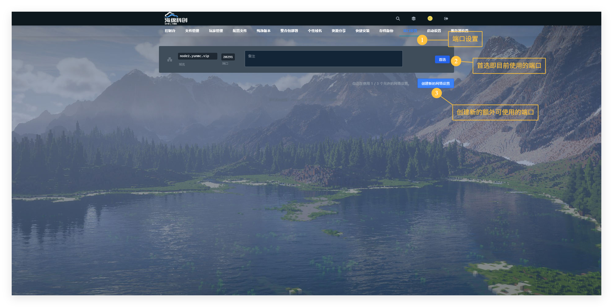 目录 搜索 展开 ✨了解海绵面板的功能💝合理的配置选择⚔️功能 | 控制台⚔️功能 | 在线文件管理⚔️功能 | 玩家管理⚔️功能 | 服务器配置⚔️功能 | 纯净部署⚔️功能 | 整合包部署⚔️功能 | 个性域名⚔️功能 | 资源分享⚔️功能 | 快捷安装⚔️功能 | 存档备份⚔️功能 | 端口设置⚔️功能 | 节点信息⚔️功能 | 服务器设置⚔️功能 | SFTP信息与重装⚔️功能 | 定时任务🧸新手入门流程指南🎮入门 | 如何登录控制台🎮入门 | 整合包部署开服🎮入门 | 如何给服务器添加MOD🎮入门 | 实用指令大全🎮入门 | 服务器基础设置🎮入门 | 配置项修改注释🎮入门 | Java地图兼容问题🎮入门 | 如何替换地图/存档🎮入门 | 基岩版开服教程🎮高级 | java版服务器概念一览🎮高级 | java版优化指南🎮高级 | 手动备份服务器存档🎮高级 |免费服务器手动备份数据🎮高级|皮肤站配置教程🔎服务端开服教学🎮高级 | Forge整合包开服🎮高级 | Fabric服务端开服🎮高级 | 使用MCDR进行开服🎮高级 | 适配大部分服务端的开服🎮高级| CurseForge整合包开服🎮高级|纯净部署核心开服🌼常见问题解决🌱常见崩溃 | 缺少启动核心🌱常见崩溃 | JAVA版本错误🌱常见崩溃 | 开服卡住不动🌱常见崩溃 | 输入命令无反应🌱常见崩溃 | 解压时红色报错🩹服务器卡顿诊断🩹必看🩹内存不足导致卡顿🩹CPU单核性能不足导致卡顿🩹网络卡顿导致🩹服务器实体或玩家导致🛜无端口解析域名⚔️通用 | 隐藏端口域名(SRV解析)⚔️付费节点专属 | 无端口域名🤔服务器防黑措施/解决方案👿防黑措施👿“比利时”岩浆毁坏解决办法🧨纯净版一键包Pro🎨 | 功能概览🎃 | 基础指令合集🔰 | 登录系统⛏ | 创世神用法🚮 | 垃圾桶 暂无相关搜索结果! 阅读次数:3385 本文档使用 MinDoc 发布 ⚔️功能 | 端口设置 端口设置作者:xiaobei 创建时间:2024-08-27 05:12最后编辑:xiaobei 更新时间:2025-12-13 14:26 提交评论