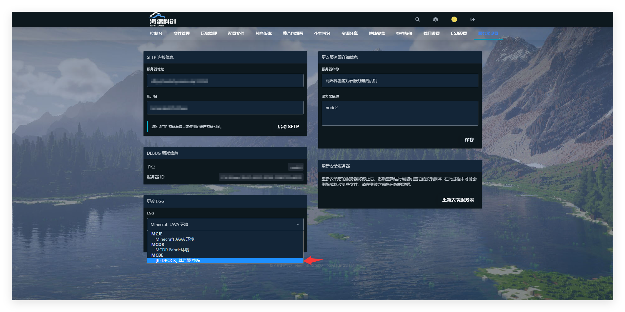 点击“服务器设置”,选择 [BEDROCK] 基岩 纯净。