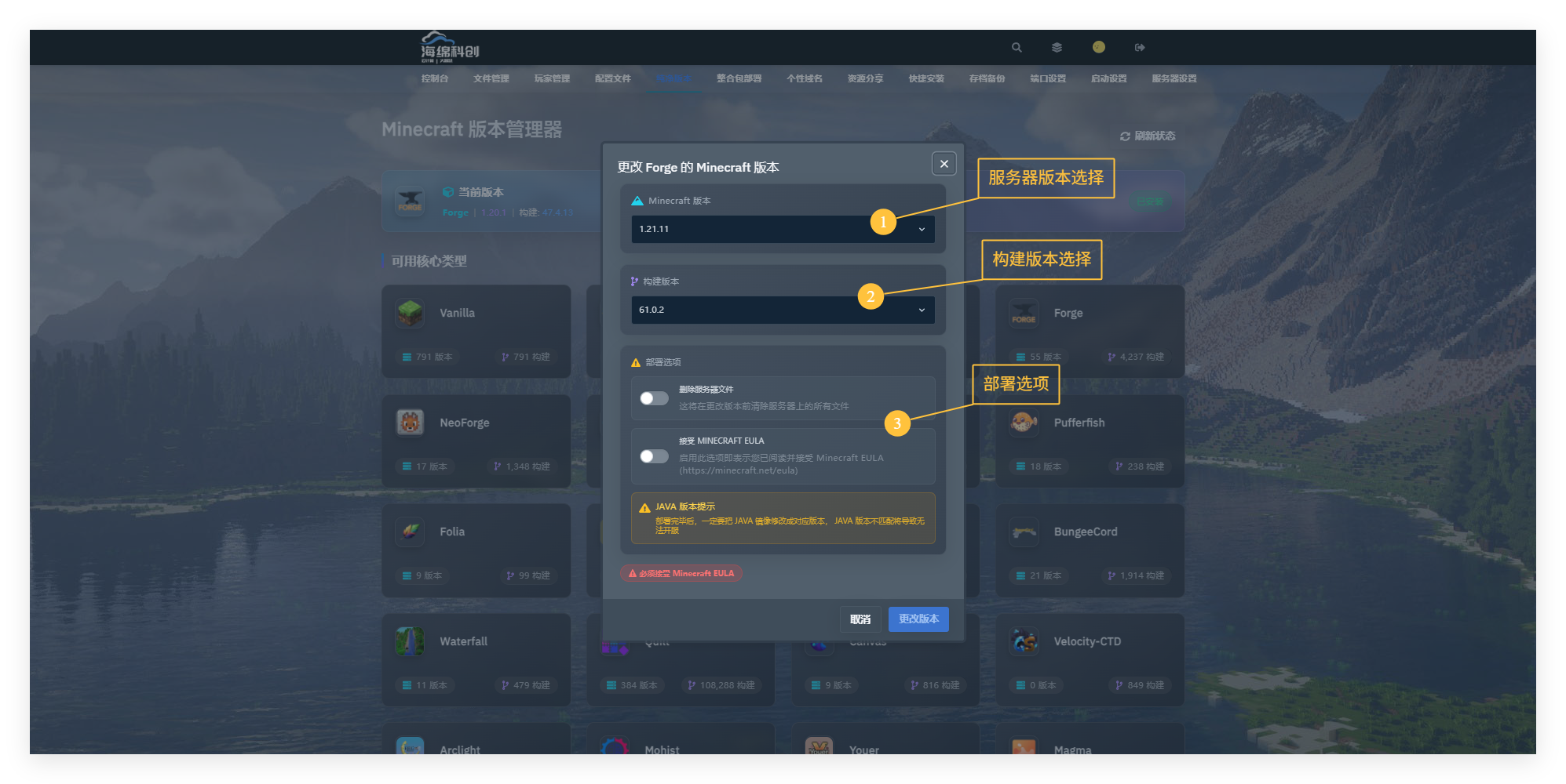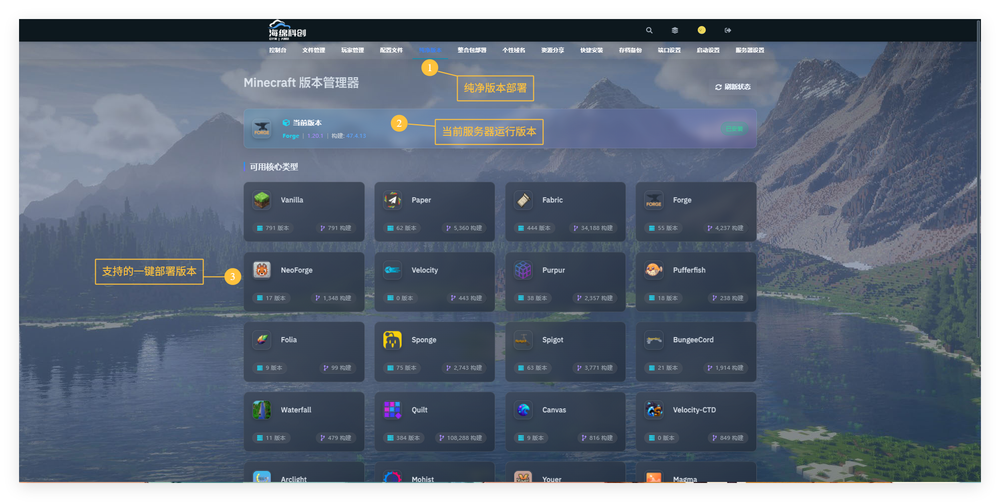 目录 搜索 展开 ✨了解海绵面板的功能💝合理的配置选择⚔️功能 | 控制台⚔️功能 | 在线文件管理⚔️功能 | 玩家管理⚔️功能 | 服务器配置⚔️功能 | 纯净部署⚔️功能 | 整合包部署⚔️功能 | 个性域名⚔️功能 | 资源分享⚔️功能 | 快捷安装⚔️功能 | 存档备份⚔️功能 | 端口设置⚔️功能 | 节点信息⚔️功能 | 服务器设置⚔️功能 | SFTP信息与重装⚔️功能 | 定时任务🧸新手入门流程指南🎮入门 | 如何登录控制台🎮入门 | 整合包部署开服🎮入门 | 如何给服务器添加MOD🎮入门 | 实用指令大全🎮入门 | 服务器基础设置🎮入门 | 配置项修改注释🎮入门 | Java地图兼容问题🎮入门 | 如何替换地图/存档🎮入门 | 基岩版开服教程🎮高级 | java版服务器概念一览🎮高级 | java版优化指南🎮高级 | 手动备份服务器存档🎮高级 |免费服务器手动备份数据🎮高级|皮肤站配置教程🔎服务端开服教学🎮高级 | Forge整合包开服🎮高级 | Fabric服务端开服🎮高级 | 使用MCDR进行开服🎮高级 | 适配大部分服务端的开服🎮高级| CurseForge整合包开服🎮高级|纯净部署核心开服🌼常见问题解决🌱常见崩溃 | 缺少启动核心🌱常见崩溃 | JAVA版本错误🌱常见崩溃 | 开服卡住不动🌱常见崩溃 | 输入命令无反应🌱常见崩溃 | 解压时红色报错🩹服务器卡顿诊断🩹必看🩹内存不足导致卡顿🩹CPU单核性能不足导致卡顿🩹网络卡顿导致🩹服务器实体或玩家导致🛜无端口解析域名⚔️通用 | 隐藏端口域名(SRV解析)⚔️付费节点专属 | 无端口域名🤔服务器防黑措施/解决方案👿防黑措施👿“比利时”岩浆毁坏解决办法🧨纯净版一键包Pro🎨 | 功能概览🎃 | 基础指令合集🔰 | 登录系统⛏ | 创世神用法🚮 | 垃圾桶 暂无相关搜索结果! 阅读次数:1435 本文档使用 MinDoc 发布 ⚔️功能 | 纯净部署 纯净部署作者:xiaobei 创建时间:2025-06-21 17:54最后编辑:xiaobei 更新时间:2025-12-13 14:26 提交评论