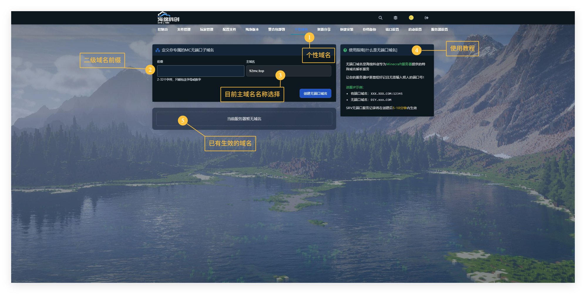 目录 搜索 展开 ✨了解海绵面板的功能💝合理的配置选择⚔️功能 | 控制台⚔️功能 | 在线文件管理⚔️功能 | 玩家管理⚔️功能 | 服务器配置⚔️功能 | 纯净部署⚔️功能 | 整合包部署⚔️功能 | 个性域名⚔️功能 | 资源分享⚔️功能 | 快捷安装⚔️功能 | 存档备份⚔️功能 | 端口设置⚔️功能 | 节点信息⚔️功能 | 服务器设置⚔️功能 | SFTP信息与重装⚔️功能 | 定时任务🧸新手入门流程指南🎮入门 | 如何登录控制台🎮入门 | 整合包部署开服🎮入门 | 如何给服务器添加MOD🎮入门 | 实用指令大全🎮入门 | 服务器基础设置🎮入门 | 配置项修改注释🎮入门 | Java地图兼容问题🎮入门 | 如何替换地图/存档🎮入门 | 基岩版开服教程🎮高级 | java版服务器概念一览🎮高级 | java版优化指南🎮高级 | 手动备份服务器存档🎮高级 |免费服务器手动备份数据🎮高级|皮肤站配置教程🔎服务端开服教学🎮高级 | Forge整合包开服🎮高级 | Fabric服务端开服🎮高级 | 使用MCDR进行开服🎮高级 | 适配大部分服务端的开服🎮高级| CurseForge整合包开服🎮高级|纯净部署核心开服🌼常见问题解决🌱常见崩溃 | 缺少启动核心🌱常见崩溃 | JAVA版本错误🌱常见崩溃 | 开服卡住不动🌱常见崩溃 | 输入命令无反应🌱常见崩溃 | 解压时红色报错🩹服务器卡顿诊断🩹必看🩹内存不足导致卡顿🩹CPU单核性能不足导致卡顿🩹网络卡顿导致🩹服务器实体或玩家导致🛜无端口解析域名⚔️通用 | 隐藏端口域名(SRV解析)⚔️付费节点专属 | 无端口域名🤔服务器防黑措施/解决方案👿防黑措施👿“比利时”岩浆毁坏解决办法🧨纯净版一键包Pro🎨 | 功能概览🎃 | 基础指令合集🔰 | 登录系统⛏ | 创世神用法🚮 | 垃圾桶 暂无相关搜索结果! 阅读次数:20 本文档使用 MinDoc 发布 ⚔️功能 | 个性域名 个性域名作者:xiaobei 创建时间:2025-12-12 14:27最后编辑:xiaobei 更新时间:2025-12-13 14:26 提交评论