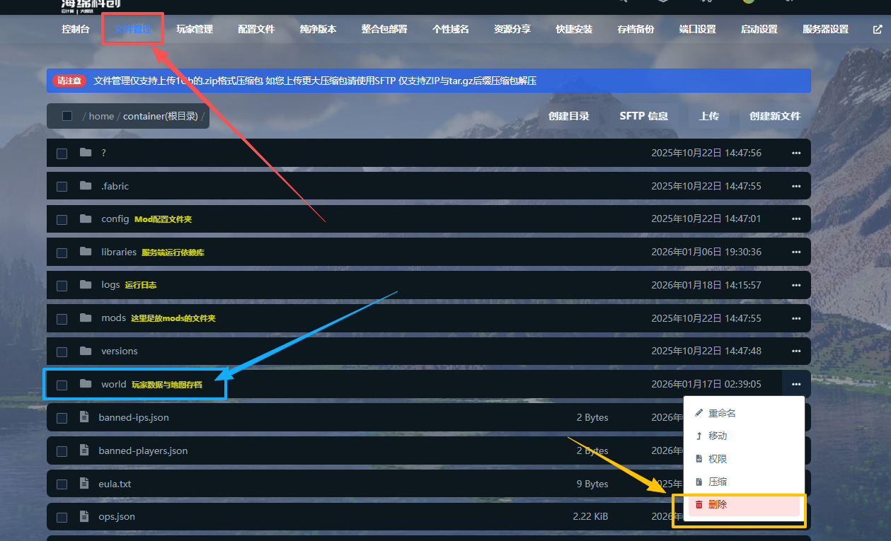 目录 搜索 展开 ✨了解海绵面板的功能💝合理的配置选择⚔️功能 | 控制台⚔️功能 | 在线文件管理⚔️功能 | 玩家管理⚔️功能 | 服务器配置⚔️功能 | 纯净部署⚔️功能 | 整合包部署⚔️功能 | 个性域名⚔️功能 | 资源分享⚔️功能 | 快捷安装⚔️功能 | 存档备份⚔️功能 | 端口设置⚔️功能 | 节点信息⚔️功能 | 服务器设置⚔️功能 | SFTP信息与重装⚔️功能 | 定时任务🧸新手入门流程指南🎮入门 | 如何登录控制台🎮入门 | 整合包部署开服🎮入门 | 如何给服务器添加MOD🎮入门 | 实用指令大全🎮入门 | 服务器基础设置🎮入门 | 配置项修改注释🎮入门 | Java地图兼容问题🎮入门 | 如何替换地图/存档🎮入门 | 基岩版开服教程🎮入门 | 如何更换地图种子🎮入门 | 如何开新档🎮高级 | java版服务器概念一览🎮高级 | java版优化指南🎮高级 | 手动备份服务器存档🎮高级 |免费服务器手动备份数据🎮高级|皮肤站配置教程🔎服务端开服教学🎮高级 | Forge整合包开服🎮高级 | Fabric服务端开服🎮高级 | 使用MCDR进行开服🎮高级 | 适配大部分服务端的开服🎮高级| CurseForge整合包开服🎮高级|纯净部署核心开服🌼常见问题解决🌱常见崩溃 | 缺少启动核心🌱常见崩溃 | JAVA版本错误🌱常见崩溃 | 开服卡住不动🌱常见崩溃 | 输入命令无反应🌱常见崩溃 | 解压时红色报错🩹服务器卡顿诊断🩹必看🩹内存不足导致卡顿🩹CPU单核性能不足导致卡顿🩹网络卡顿导致🩹服务器实体或玩家导致🛜无端口解析域名⚔️通用 | 隐藏端口域名(SRV解析)⚔️付费节点专属 | 无端口域名🤔服务器防黑措施/解决方案👿防黑措施👿“比利时”岩浆毁坏解决办法🧨纯净版一键包Pro🎨 | 功能概览🎃 | 基础指令合集🔰 | 登录系统⛏ | 创世神用法🚮 | 垃圾桶 暂无相关搜索结果! 阅读次数:102 本文档使用 MinDoc 发布 🎮入门 | 如何开新档 如何删除现有存档 给服务器开新档步骤1:进入控制台 将服务器关机步骤2:进入文件管理 找到 world文件夹 点击右侧小点进行删除步骤3:删除后 回到控制台开服进入服务器后您的服务器现有存档已被删除如果您想更换地图种子 请看🎮入门 | 如何更换地图种子作者:海绵联机 创建时间:2026-01-25 12:30最后编辑:海绵联机 更新时间:2026-01-25 12:35 提交评论